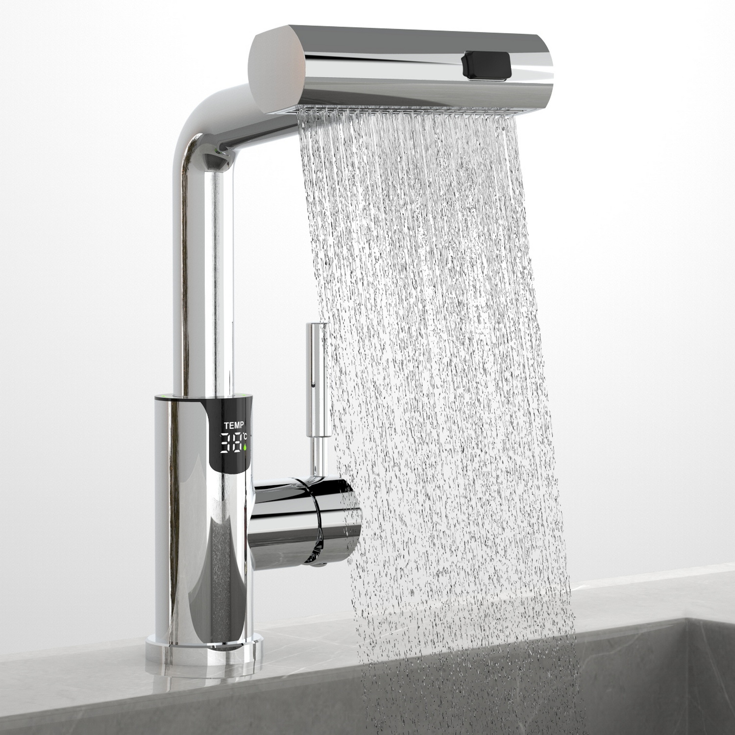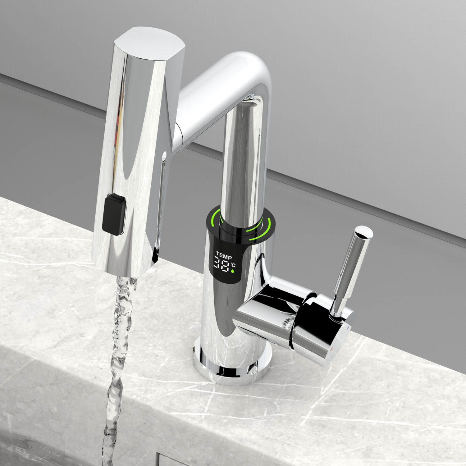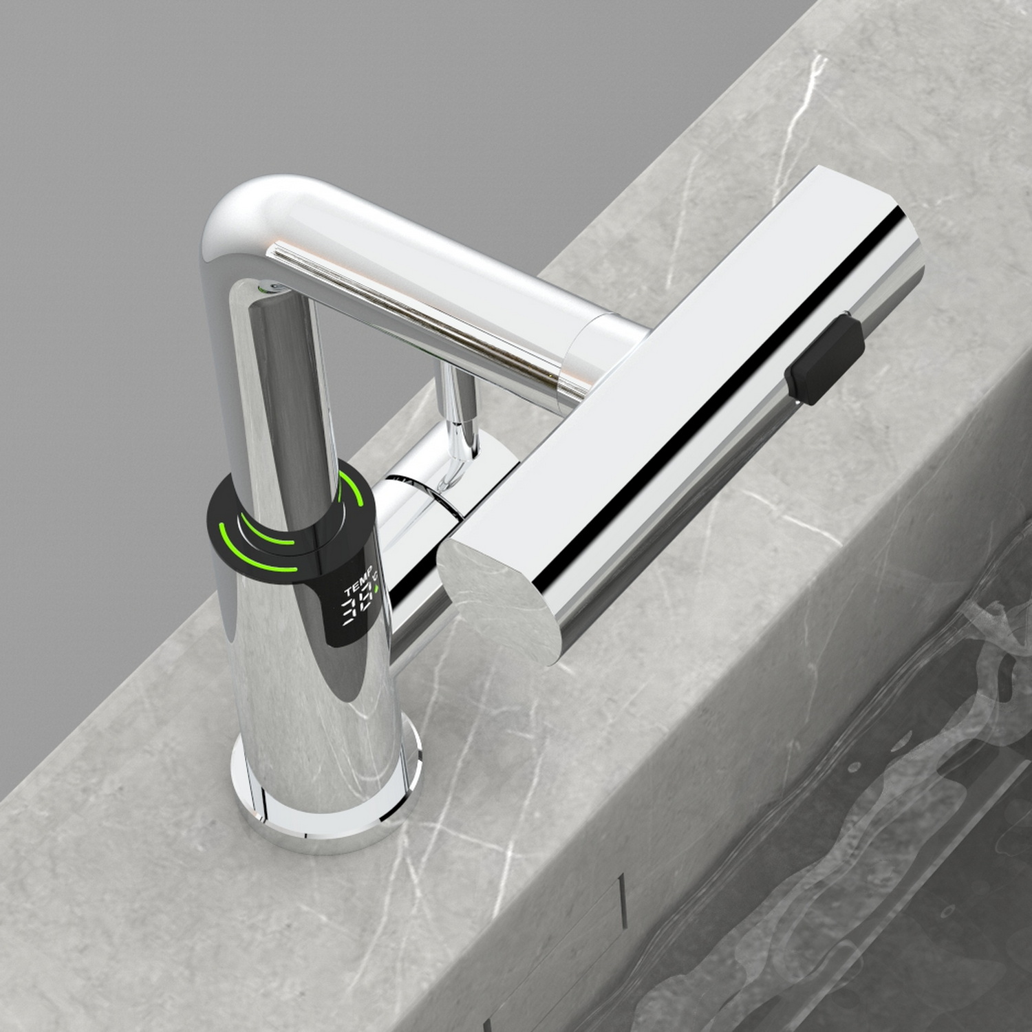• Электронное табло, расположенное в нижней части корпуса, на которое выводится показание температуры воды с подсветкой красного, зеленого и синего цвета.