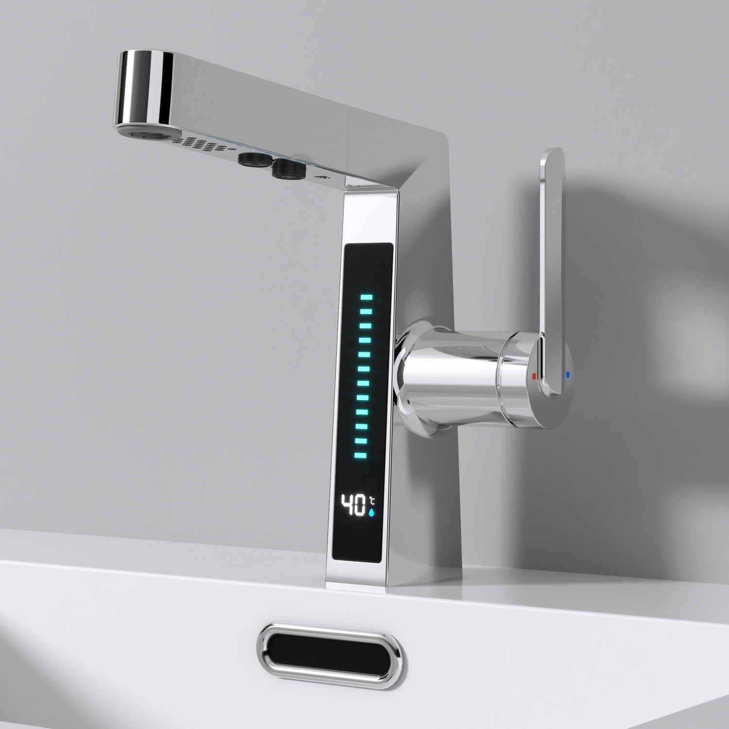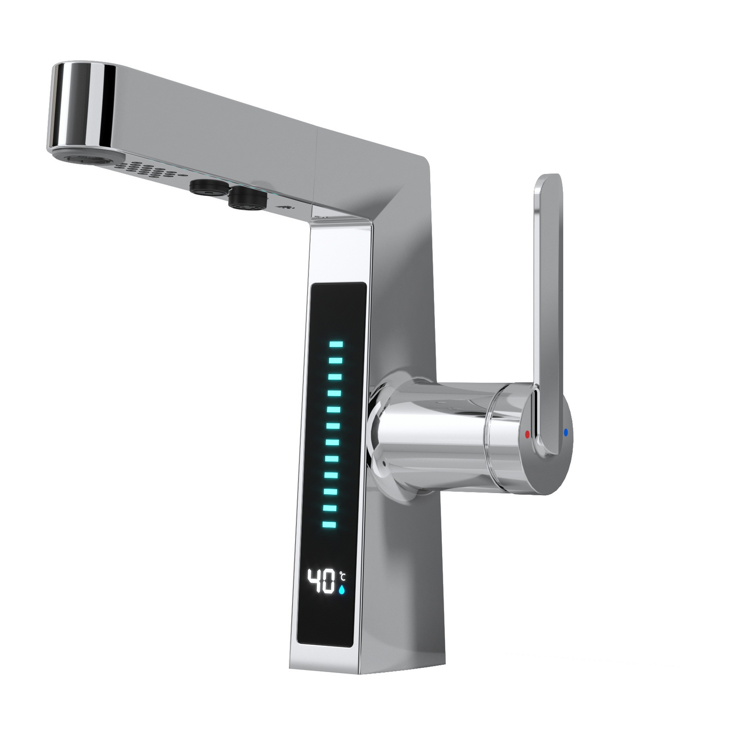 • Электронное табло, расположенное в нижней части корпуса, на которое выводится показание температуры воды с подсветкой красного, зеленого и синего цвета.