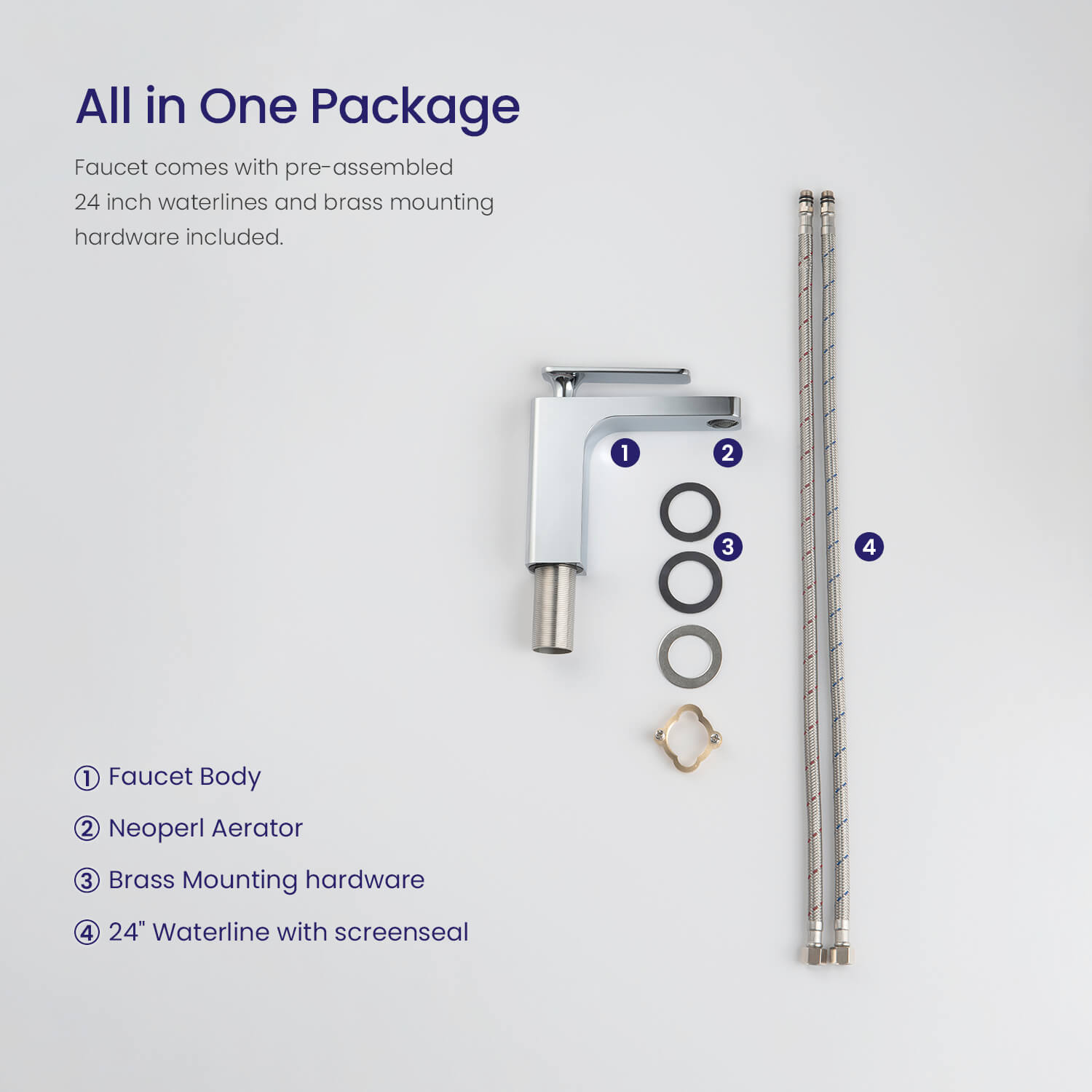 Смеситель-1шт.Гибкая подводка-2шт.Набор креплений-1шт.Инструкция-1шт