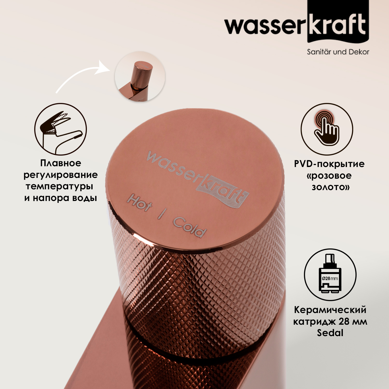 PVD-покрытие «розовое золото».Покрытие помогает защитить поверхность изделий от воздействия внешней среды. Для ухода за изделиями WasserKRAFT достаточно теплой воды, мыльного раствора и сухого полотенца. Технология нанесения.Очищенное заранее изделие, помещается в вакуум, где с помощью конденсации пара наносится покрытие. При этом, конденсат пара содержит частицы необходимых металлов для получения нужного цвета. Далее наносится лак и изделие отправляется сушиться.