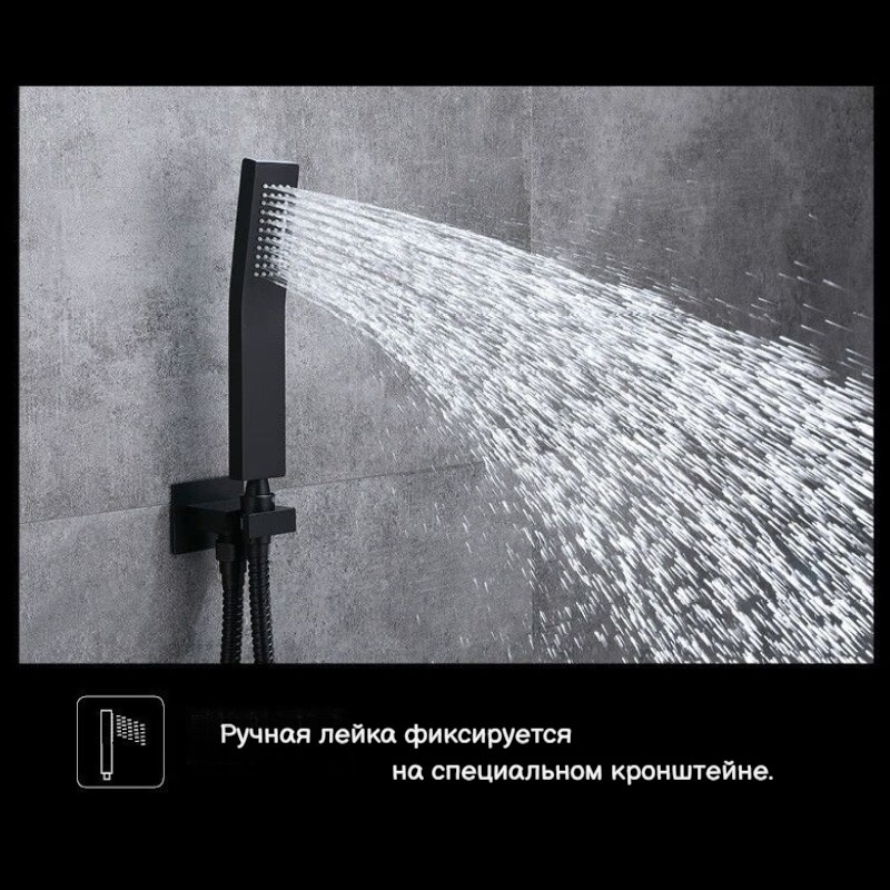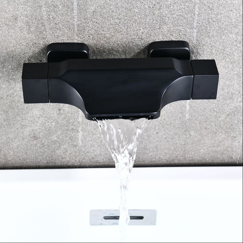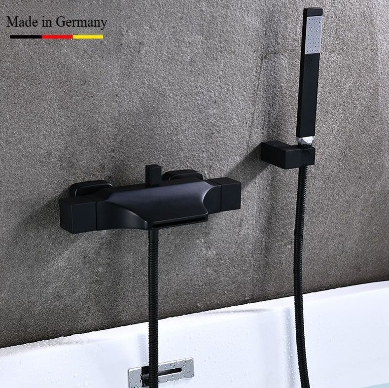 Шикарный смеситель черного цвета для ванной комнаты монтируется на стену с помощью монтажного комплекта. Душевой комплект для ванны дополнен душевым гарнитуром: лейкой и шлангом с креплением на стену. Ручная лейка фиксируется на специальном кронштейне. Поворотный рычаг с керамическим картриджем обеспечивает переключение потоков. Корпус смесителя устойчив к царапинам, экологичен и безопасен для вашего здоровья.