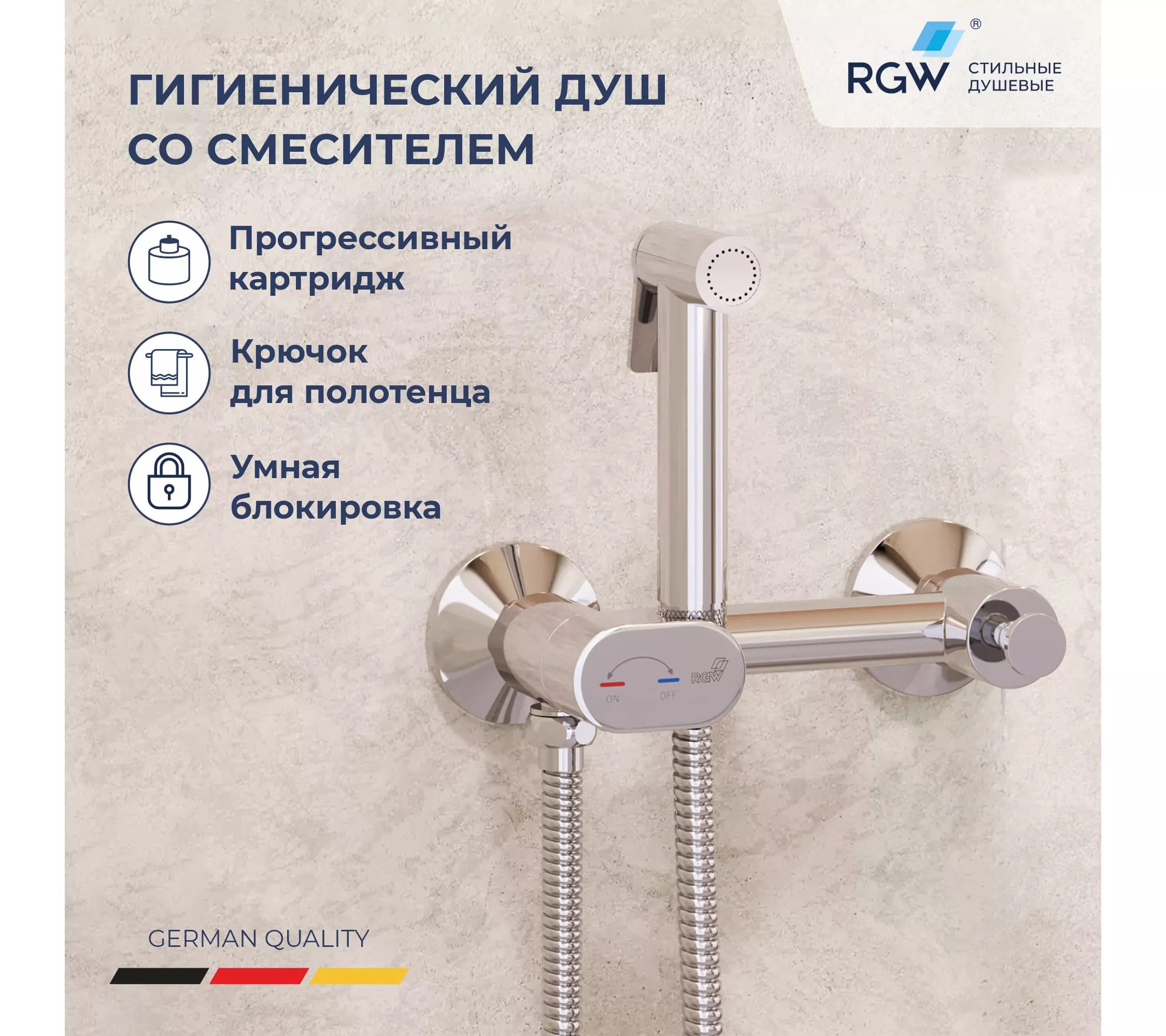 Гигиенический душевой комплект RGW SP-216 — это смеситель настенный, кран держатель лейки с поворотным управлением холодная и горячая вода, ручная лейка — RGW SP-216.