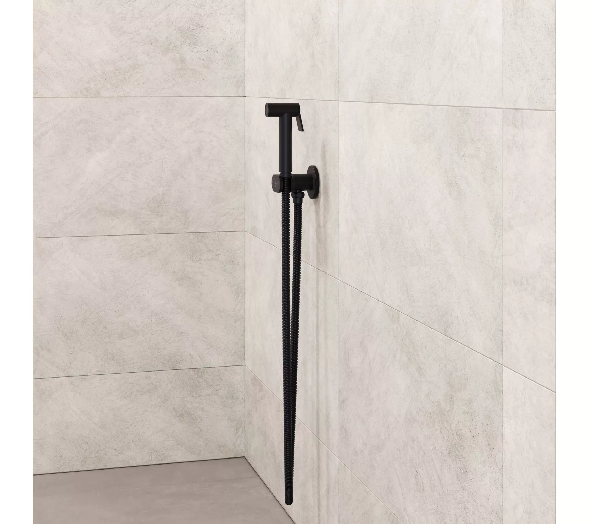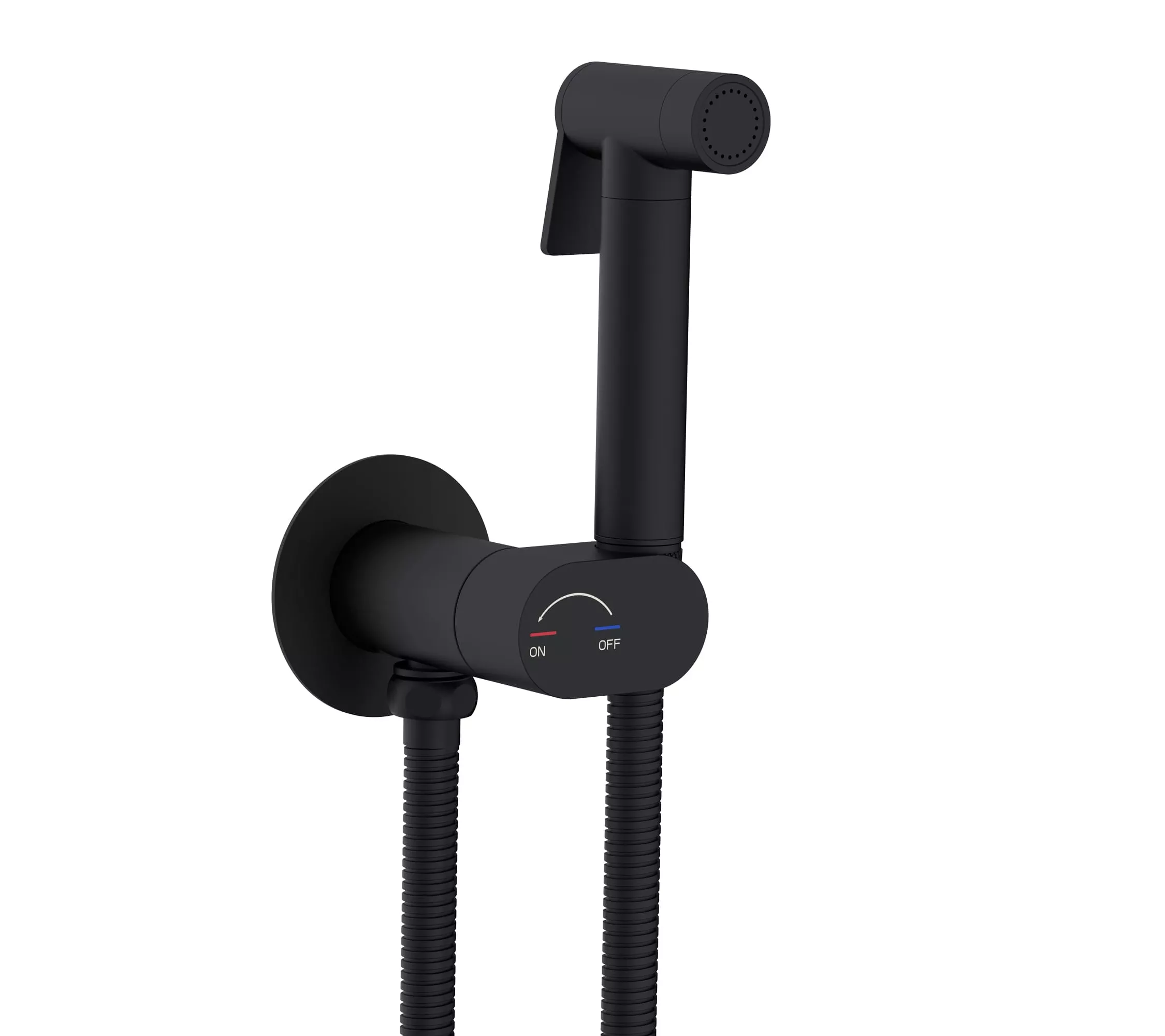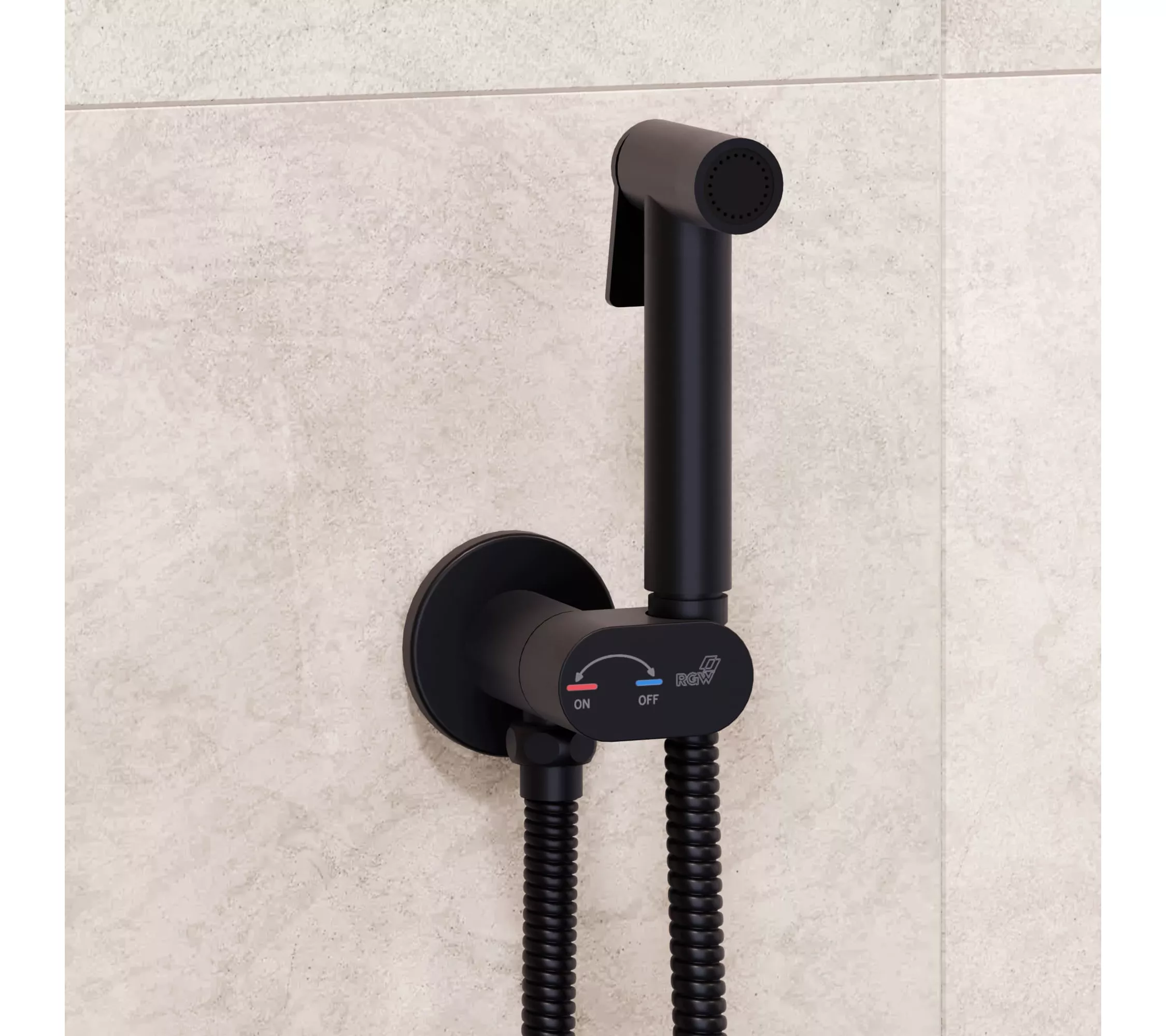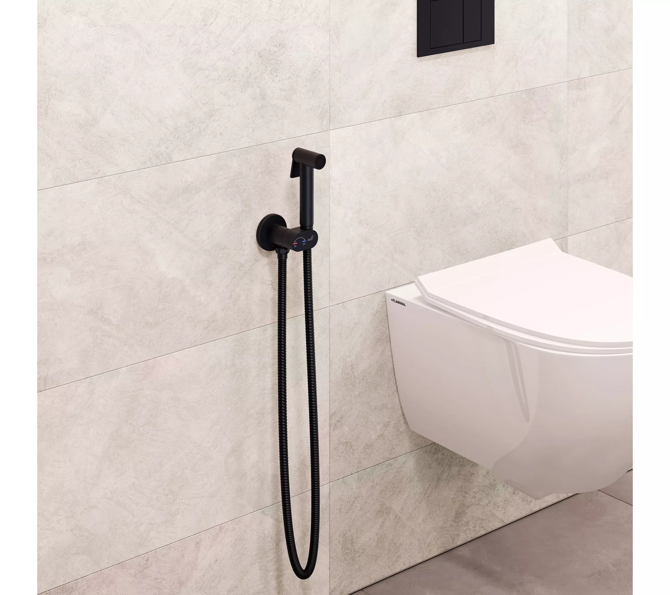 Смеситель круглой формы с гигиенической лейкой со средней струей. Струя из гигиенического душа выходит плотная, упругая и направленная. Она может быть как мягкой рассеянной, так и интенсивной, в зависимости от выбранного напора воды. Её температура легко регулируется от прохладной до комфортно тёплой. Вода подаётся равномерно, без пульсаций, обеспечивая точное и аккуратное очищение. Форма струи в этой модели узконаправленная, что делает её удобной для гигиенических процедур.
