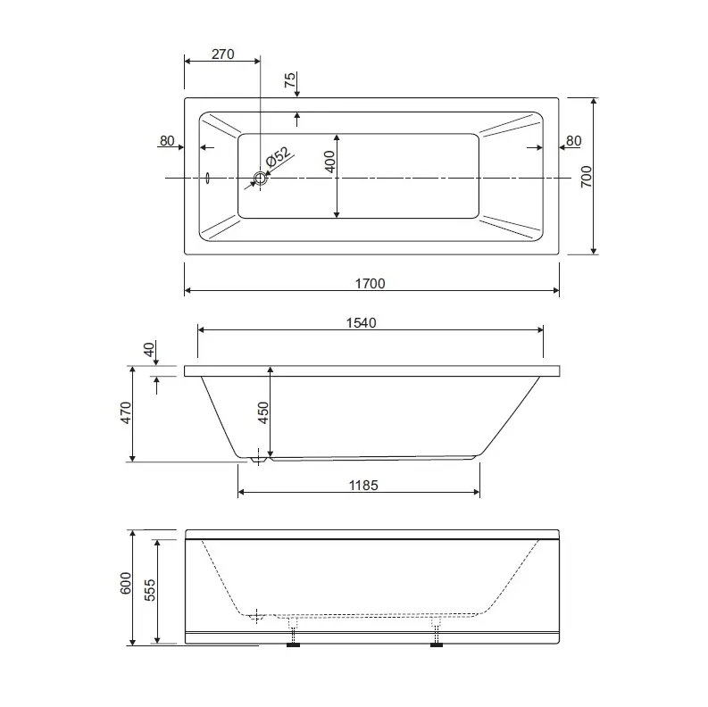 Акриловая ванна CEZARES PLANE SOLO-170-70-45-W37