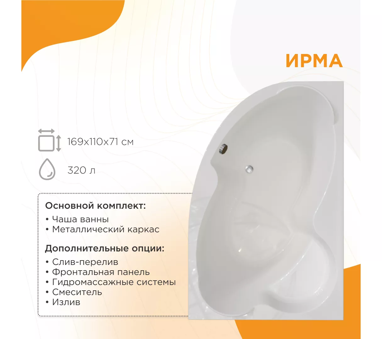 Акриловая ванна "Ирма" – хит продаж! Двусторонняя угловая ванна с удобным сиденьем. Она обладает своим особым стилем и характером, поэтому так вам полюбилась.