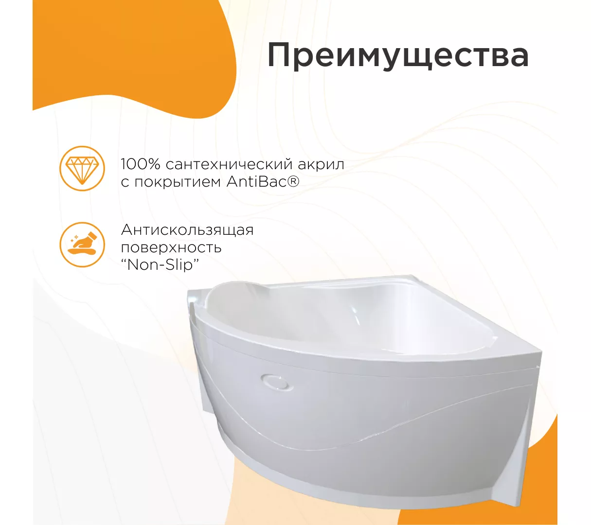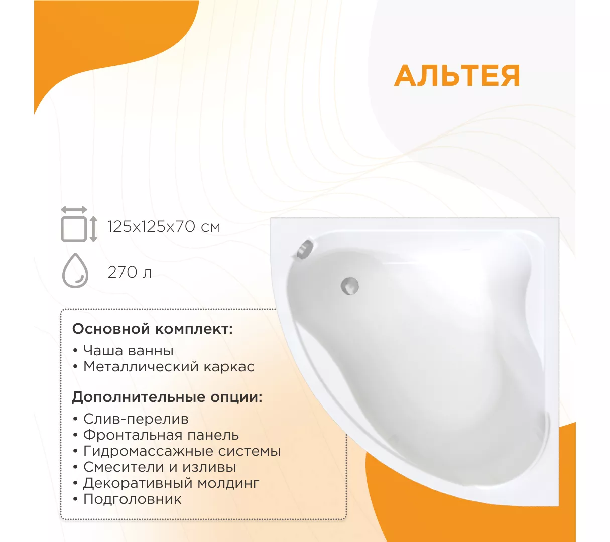 Акриловая ванна "Альтея" 125х125 – равносторонняя угловая модель, компактная снаружи и вместительная внутри. Занимая один свободный угол в ванной комнате, треугольная ванна позволяет принять положение полулежа или сидя. С ней можно установить душевую систему разного типа и не опасаться разбрызгивания воды за пределы ванны.
