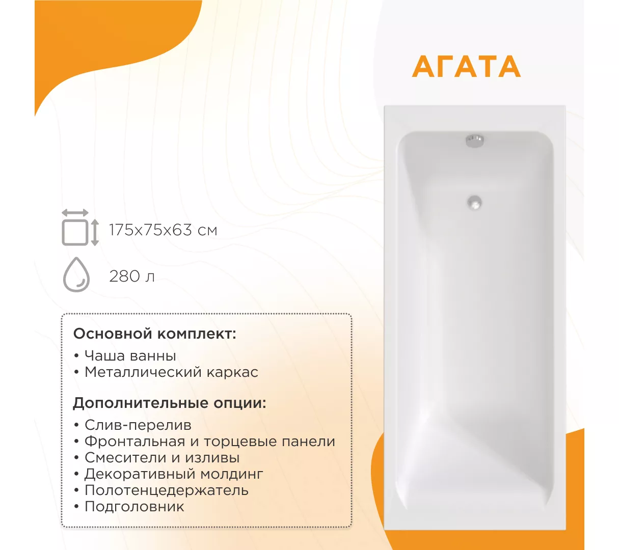 Акриловая ванна "Агата" - модель с инновационной концепцией. Эта удобная, недорогая и практичная ванна продается с комплектом для самостоятельной сборки, что позволяет сэкономить на монтаже и собрать ванну своими руками. К ванне прилагается подробная инструкция по сборке и установке.