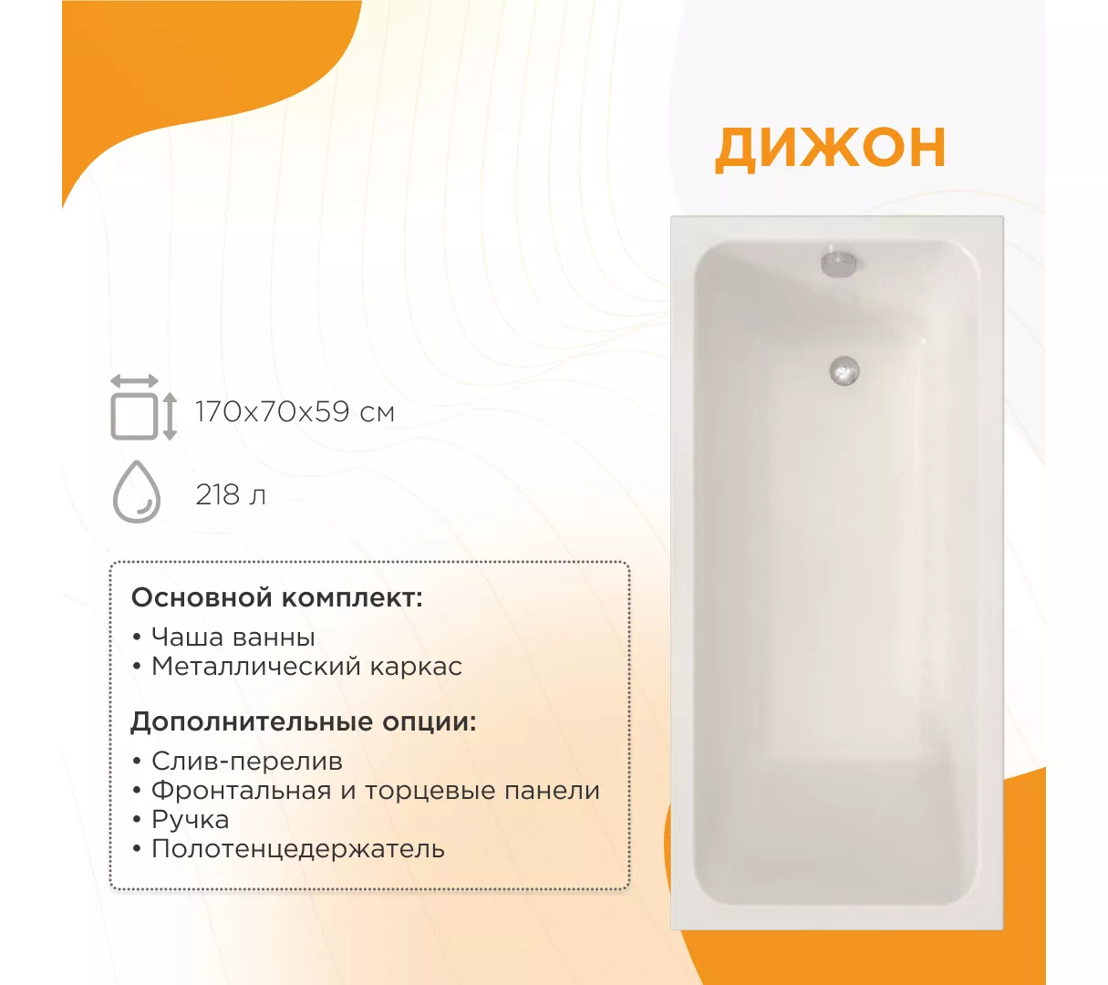 Ванна "Дижон" - прекрасный вариант, когда требуется купить надежную и компактную прямоугольную ванну по привлекательной цене. Угол наклона "спины" ванной обеспечивает комфортное погружение даже при ее небольших габаритах. Понравится всем, кто предпочитает классические и минималистичные формы. Прямоугольная ванна в ванной комнате наилучшим образом вписывается в пространство и является практичным выбором. Благодаря актуальным узким бортам ванна "Дижон" отлично дополнит любой, даже самый ультрамодный интерьер ванной комнаты.