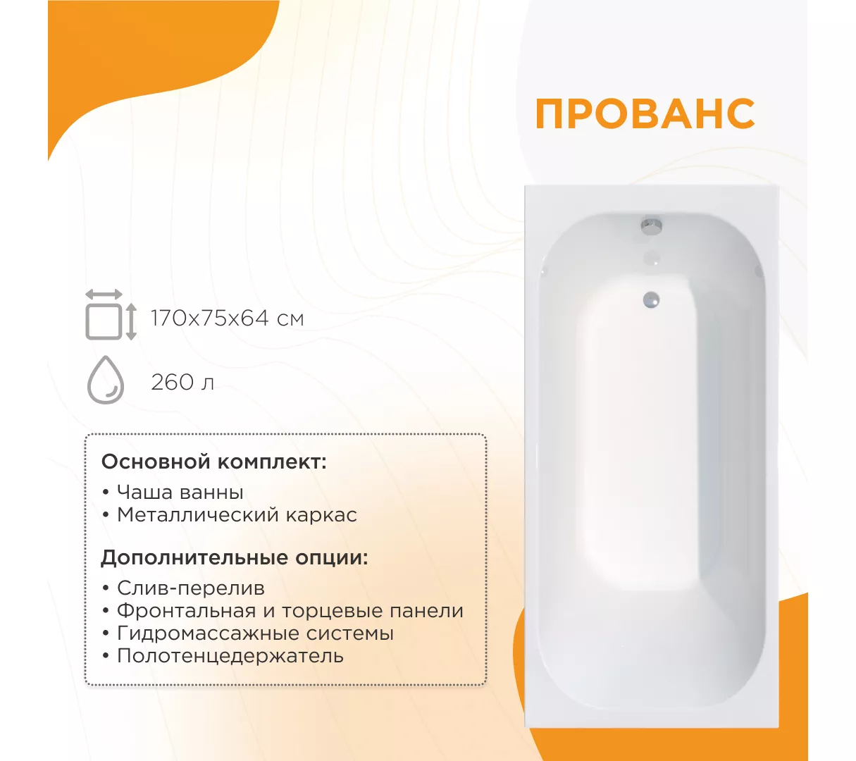 Прямоугольная ванна "Прованс" универсальна в плане дизайна и размеров, поэтому отлично подойдет для семей из нескольких человек. Ванна подходит для людей любого роста и комплекции. Благодаря большой глубине 48 см и высоким бортам внутри будет удобно как крупному папе, так и миниатюрной невысокой маме. Регулировав наполнение ванны, можно без проблем купать детей любого возраста, а брызги во время водных игр не будут разлетаться по всей ванной комнате. Как двухместная ванна, "Прованс" понравится тем, кто любит создавать романтическую обстановку и хочет принимать ванну в компании любимого человека. Акриловая прямоугольная ванна обладает повышенной устойчивостью, будет долго держать тепло и подарит вам много приятных минут вдвоем.