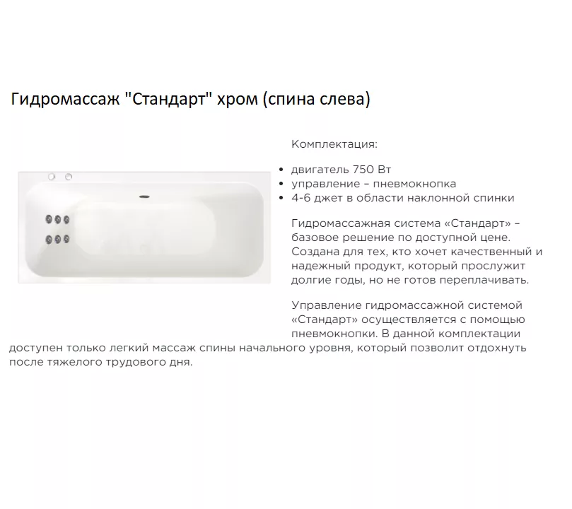 Цена указана за стандартную комплектацию: чаша ванны, опорная рама, слив-перелив, фронтальная панель