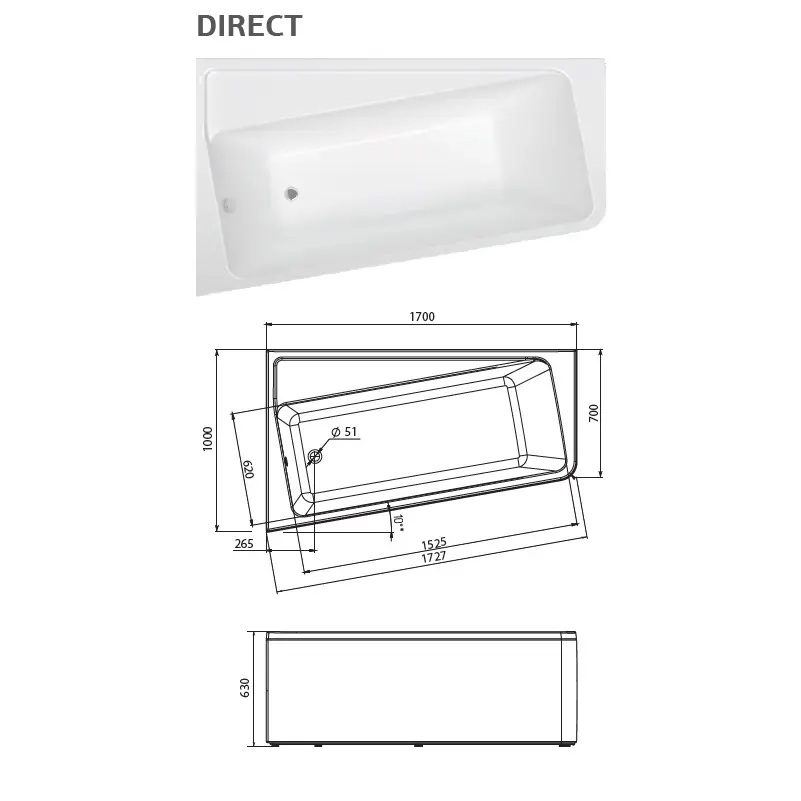 Ассиметричная ванна Direct - современное переосмысление дизайна классической акриловой ванны, не жертвующее ее практичностью. Ванна предлагает увеличенное полезное пространство благодаря оригинальному расположению купели