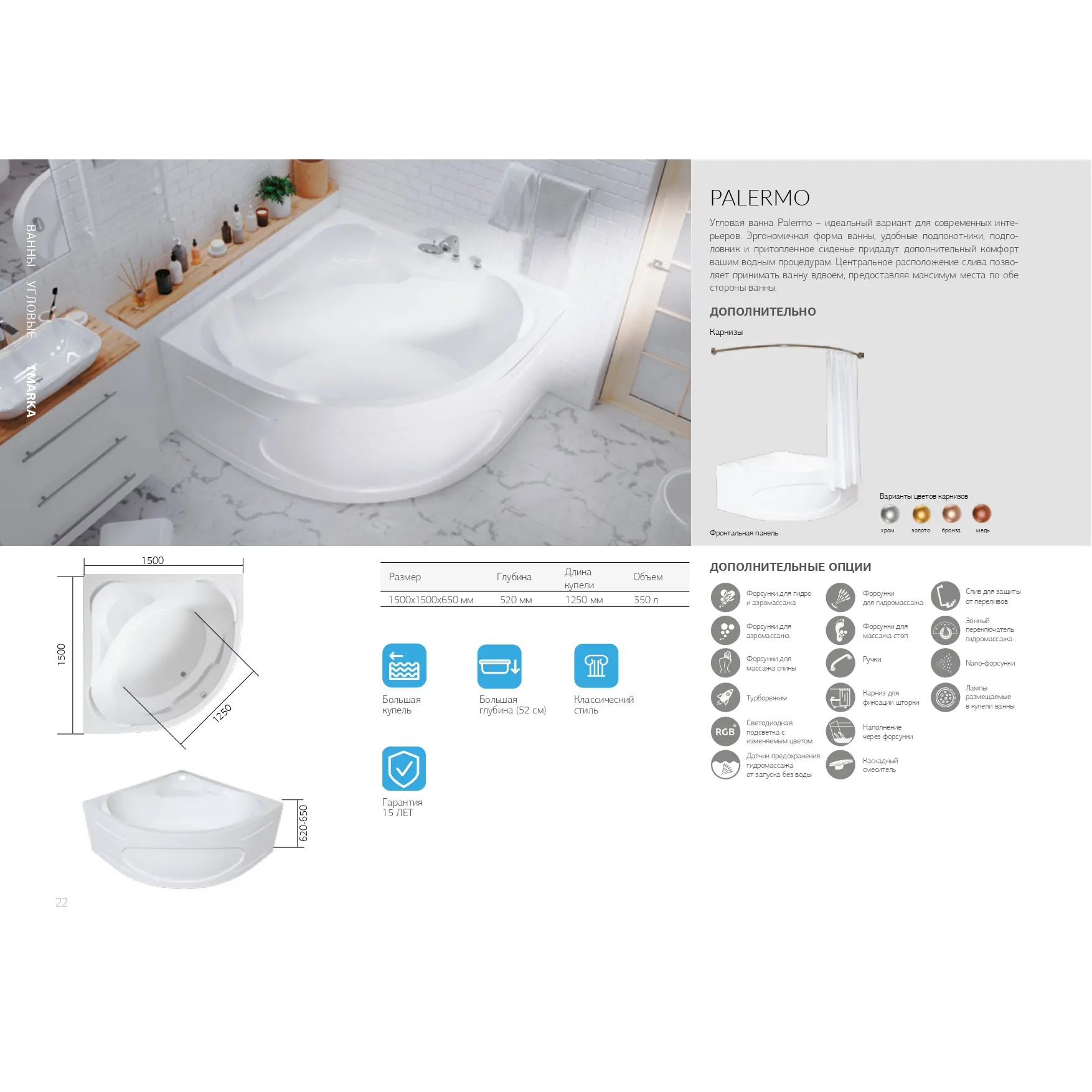Угловая акриловая ванна размером 120x120 см — идеальный вариант для стильного и функционального оформления современной ванной комнаты. Благодаря своему элегантному и сдержанному дизайну, она подчеркнёт изысканный вкус владельца и обеспечит максимальный комфорт во время водных процедур.