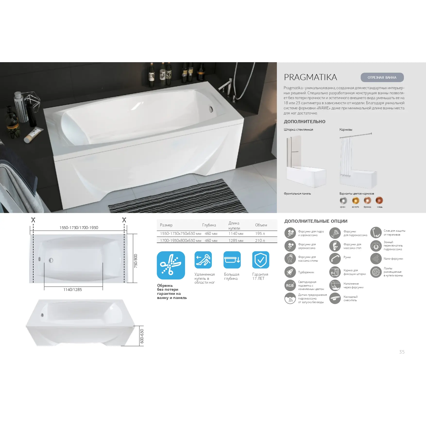 Ванну Pragmatika, выполненную в европейском рубленном стиле, можно уменьшить на 18 см без потери прочности и эстетичности. Таким образом, максимальная длина ванны 173 см, а минимальная 155 см, что позволит ей точно вписаться под необходимый размер ниши. Благодаря уникальной системе формовки «WAWE» даже при самой минимальной длине ванны - купель достаточно вместительная и прием ванны комфортен как лежа, так и сидя.