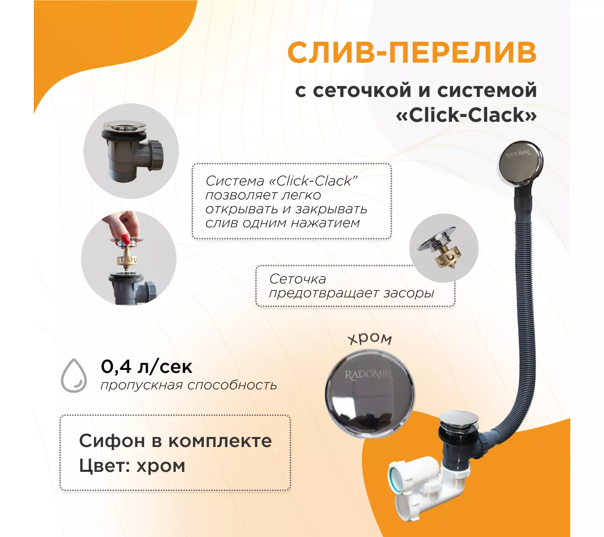 Слив-перелив с сеточкой и системой «Click-Clack»— это современное и функциональное решение для ванной комнаты. Сеточка слива защищает канализацию от засоров.