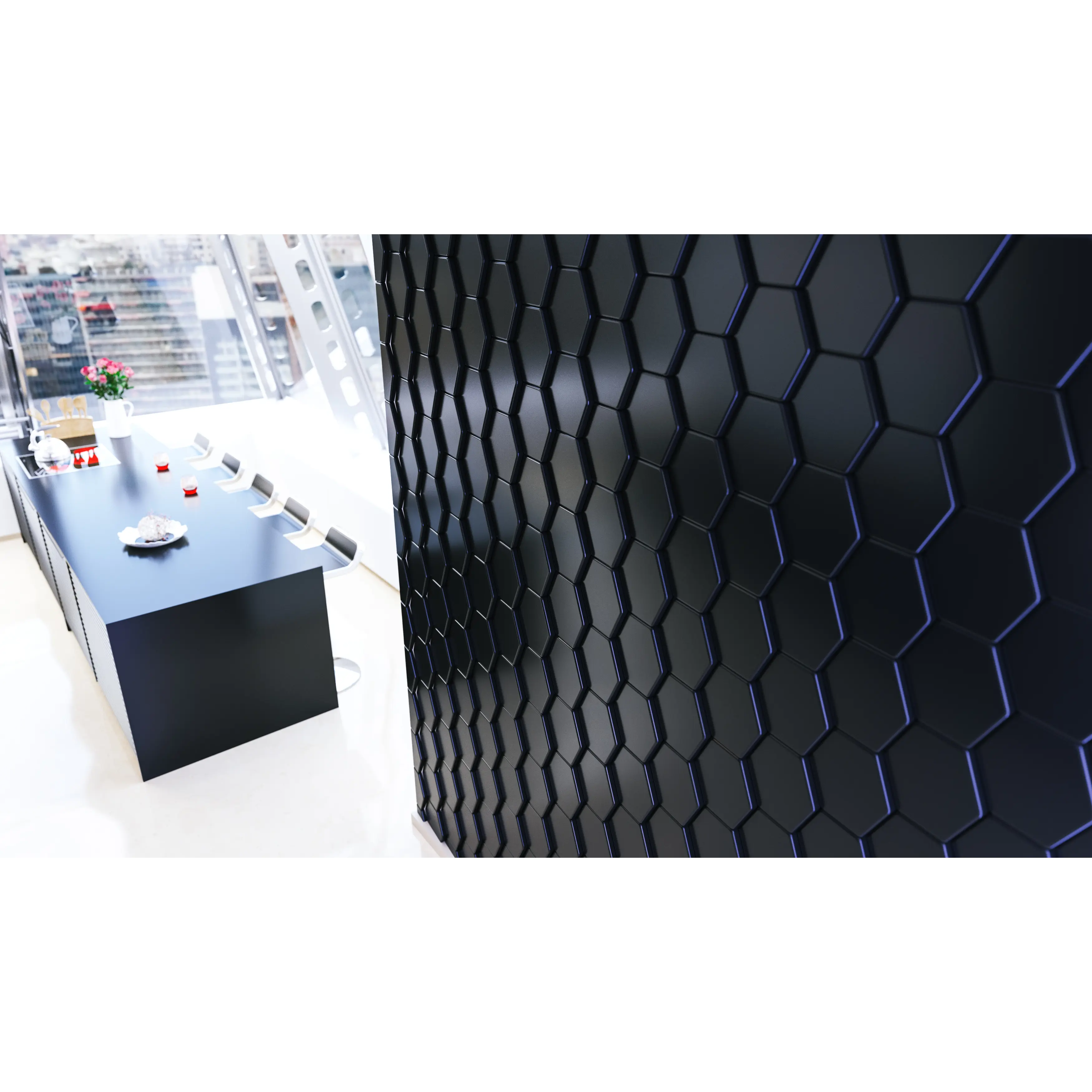 Полюбившийся многим дизайн BEE, напоминающий пчелиные соты, привносит в помещение спокойствие и сдержанность. Такой декор прекрасно вписывается в большинство современных интерьеров: от минимализма до хай-тека. 3D-панели можно использовать для отделки одной стены, небольшой ниши или для создания оригинального рисунка, плавно переходящего со стены на потолок. Благодаря уникальному фарфоровому эффекту даже неокрашенные гипсовые панели способны привнести в комнату нужную атмосферу, а правильно подобранная краска поможет создать теплую матовую или холодную глянцевую поверхность. Среди дополнительных преимуществ отделочного материала: негорючесть, экологичность, долгий срок службы и возможность реставрации.