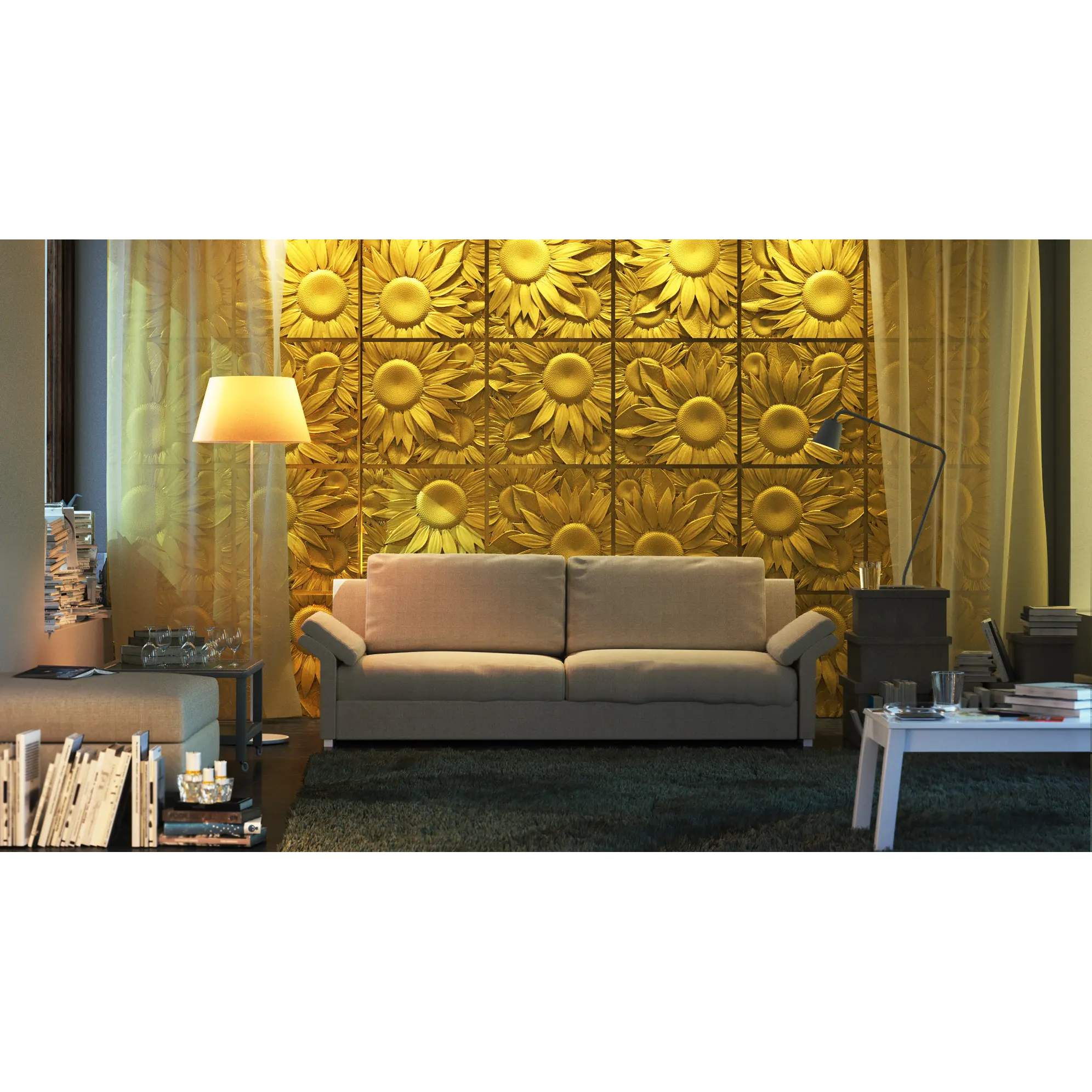 Коллекция SUNFLOWER от ARTPOLE — это яркое напоминание о солнечном лете и знаменитых «Подсолнухах» Ван Гога. Станьте художником и выберите сами, как расположить и в какой цвет окрасить гипсовые панели — любая раскладка и оттенок подчеркнут уникальность вашего интерьера. Декор можно использовать в качестве панно или отделать полностью одну из стен или потолок. Благодаря яркости и нетривиальному решению такая отделка будет роскошно смотреться как в жилых комнатах, так и в общественных помещениях, особенно в сочетании с дополнительной акцентной подсветкой. 3D-панели из гипса легко монтируются, отличаются экологичностью, негорючестью, легкостью реставрации в случае появления сколов.