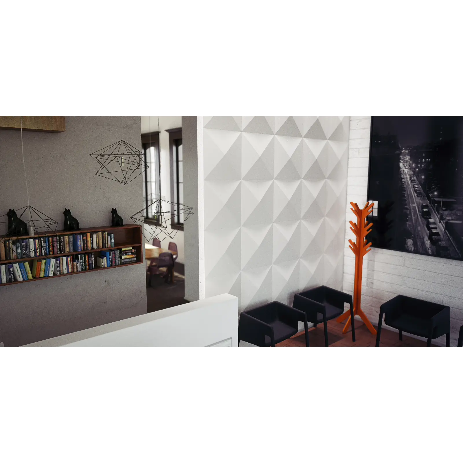 Коллекция ZOOM X4 — это многократно увеличенный популярный декор 3D-панелей ZOOM, вместо 16 геометрически идеальных пирамид дизайнеры разместили одну объемную пирамиду, дополнительно увеличив высоту рельефа на 10 мм. Такое эффектное решение придется по душе всем ценителям яркого дизайна, привлекающего внимание с первого взгляда. Гипсовые панели подойдут для отделки стен в просторных помещениях, от приемной зоны в крупной компании до лекториев и читальных залов. Декор гармонично сочетается с большинством современных стилей, в том числе конструктивизмом и минимализмом, а для еще большего акцента на объемности геометрического узора достаточно добавить подсветку.