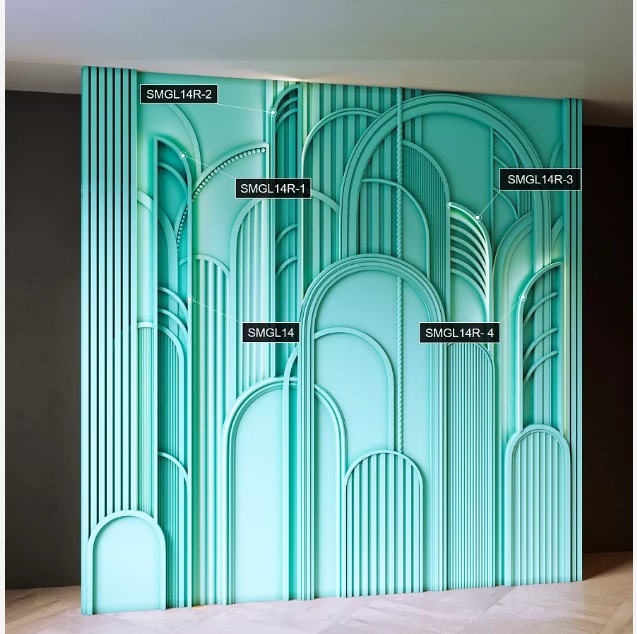 Обращаем ваше внимание на расположение радиусных молдингов на панно ARTPOLIS. Комплект световых радиусных молдингов SMGL14R-1, 2, 3, 4 продается только к панно ARTPOLIS, для установки на панели SPN7-1, SPN7-2, SPN7-9, SPN7-10 и SPN7-15 соответственно.