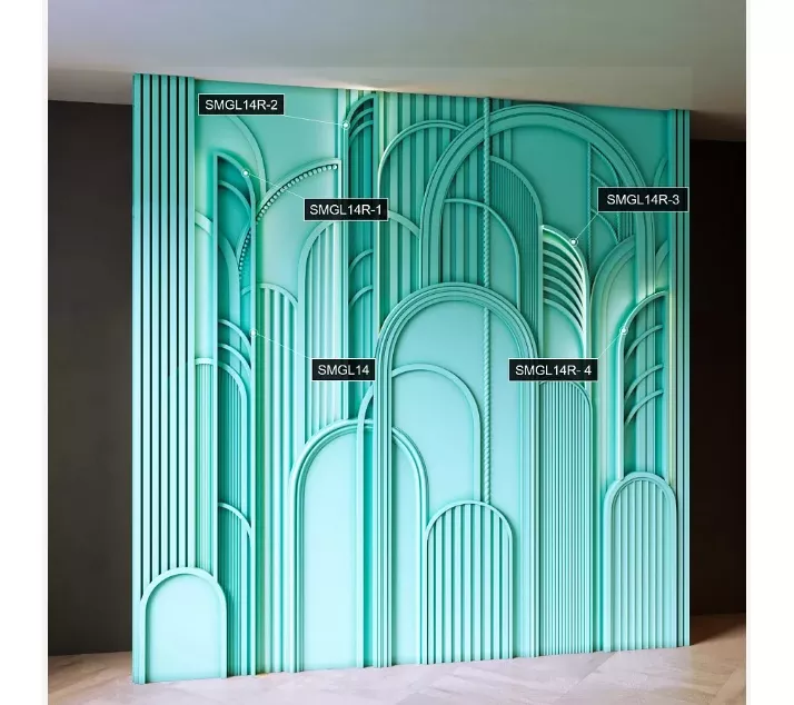 Обращаем ваше внимание на расположение радиусных молдингов на панно ARTPOLIS. Комплект световых радиусных молдингов SMGL14R-1, 2, 3, 4 продается только к панно ARTPOLIS, для установки на панели SPN7-1, SPN7-2, SPN7-9, SPN7-10 и SPN7-15 соответственно.