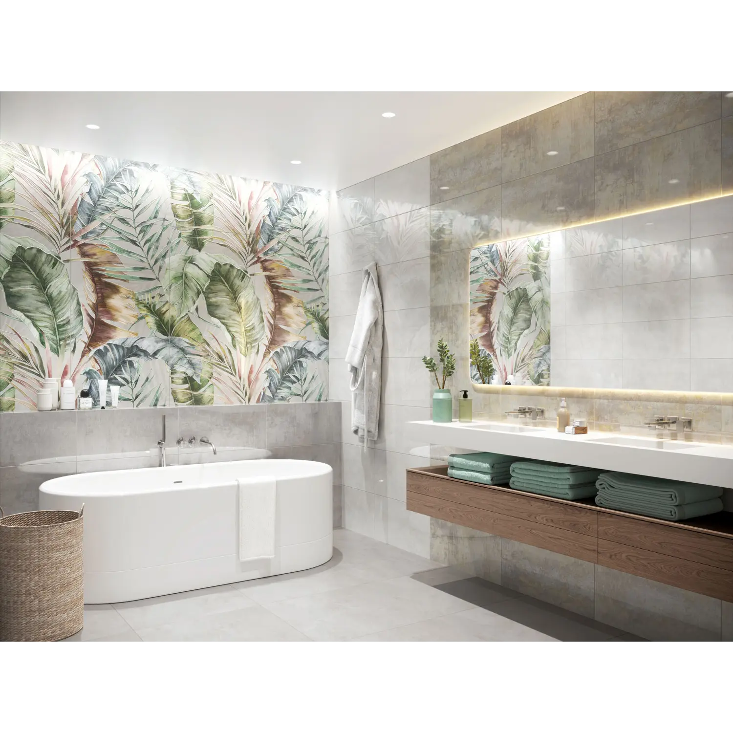 Infinium – это манифест современного дизайна, который смело объединяет красоту бетона и изящные мотивы природы. Три глянцевые, керамические плиты формата 30х60, имитирующие бетонную поверхность, задают тон всему пространству. Глянцевое покрытие придает плитке элегантность, играя отблесками света и визуально увеличивая пространство. Эта коллекция – идеальное решение для создания интерьера в стиле лофт или современного минимализма. Простота и лаконичность форм, присущие бетону, гармонично сочетаются с функциональностью и практичностью керамогранита. Центральным элементом коллекции является керамогранитная плита 60х120. Эффект Digital гранильи создает объем, привнося в интерьер ощущение природной нежности. Контраст между текстурой бетона и изящными очертаниями растений придает коллекции особый шарм, делая ее по-настоящему уникальной.