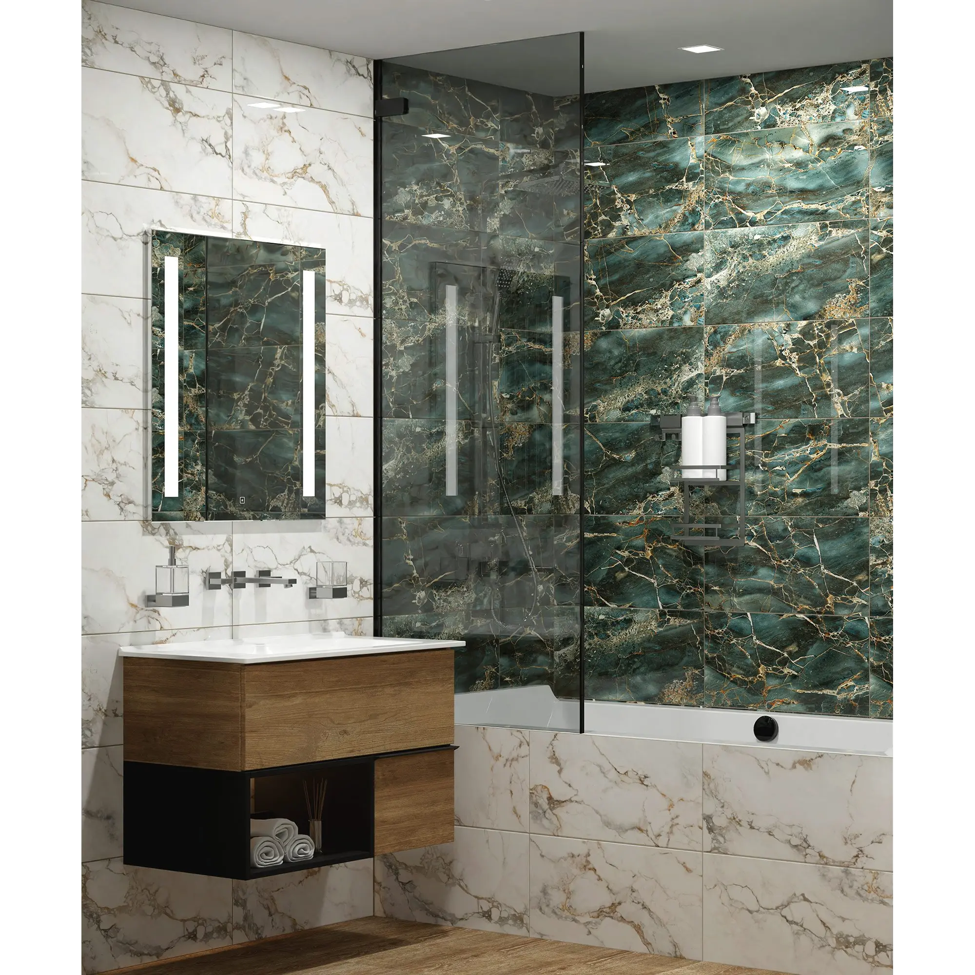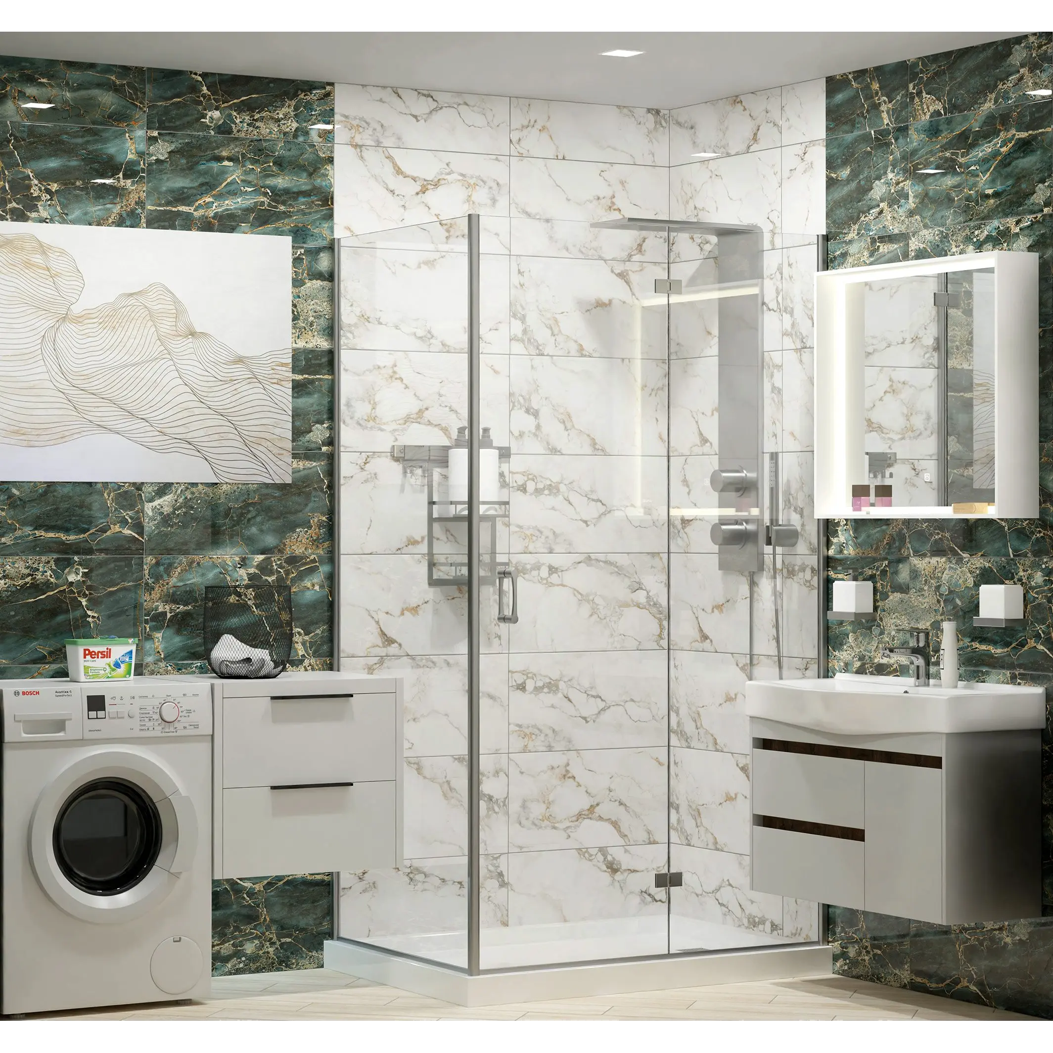 Коллекция Marigold представлена в двух гармоничных оттенках: зеленый - позволяет создать атмосферу свежести и природной гармонии, актуальной в современных интерьерах, а белый идеально подходит для тех, кто стремится к спокойствию и комфорту в своём пространстве. Керамические плиты имитируют мрамор с множеством золотых прожилок, которые словно лучи солнца, изящно пересекают поверхность, придавая плите глубину и изысканность. Формат коллекции 30х60 см обеспечивает универсальность в применении, что делает их идеальным выбором для создания интерьера.