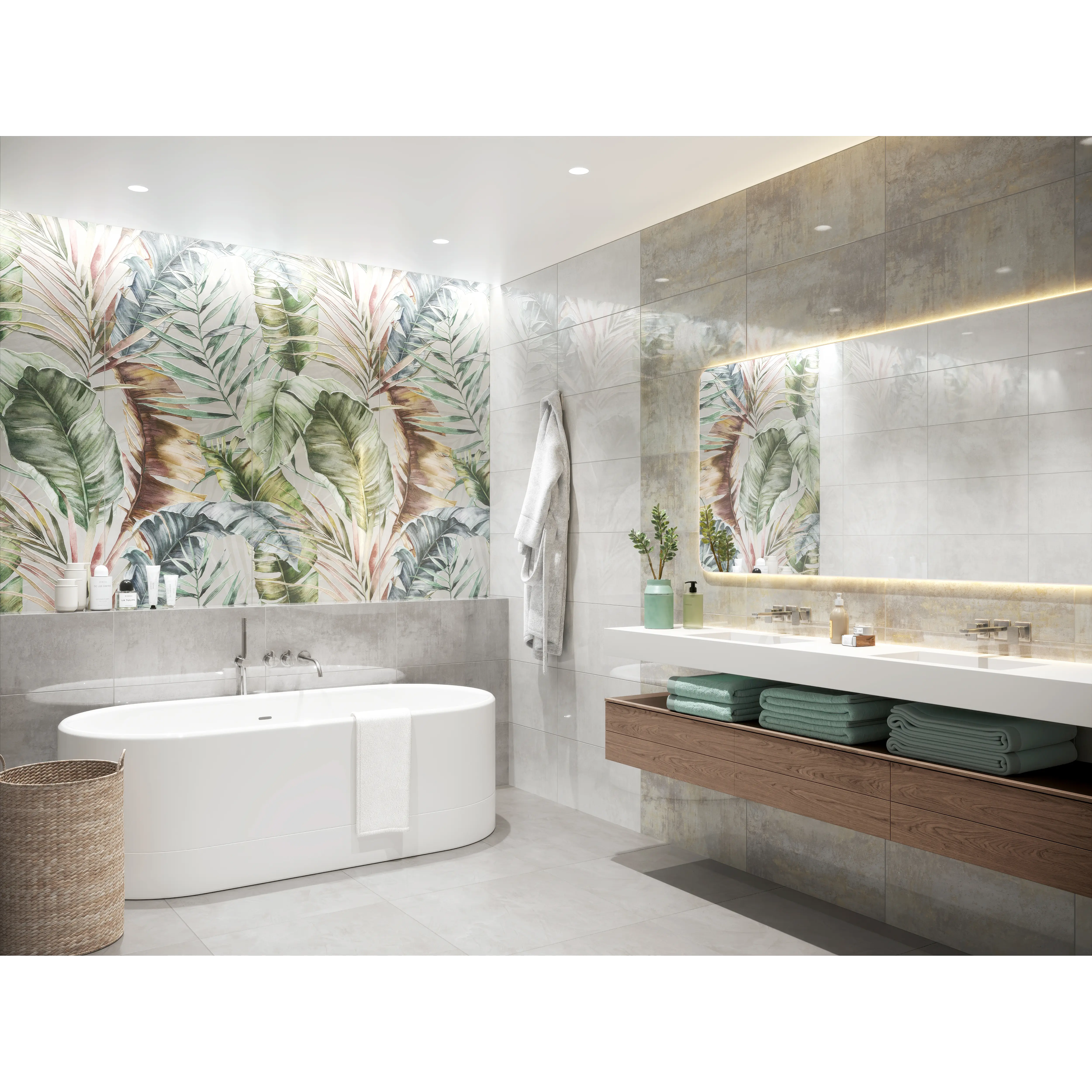Infinium – это манифест современного дизайна, который смело объединяет красоту бетона и изящные мотивы природы. Три глянцевые, керамические плиты формата 30х60, имитирующие бетонную поверхность, задают тон всему пространству. Глянцевое покрытие придает плитке элегантность, играя отблесками света и визуально увеличивая пространство. Эта коллекция – идеальное решение для создания интерьера в стиле лофт или современного минимализма. Простота и лаконичность форм, присущие бетону, гармонично сочетаются с функциональностью и практичностью керамогранита. Центральным элементом коллекции является керамогранитная плита 60х120. Эффект Digital гранильи создает объем, привнося в интерьер ощущение природной нежности. Контраст между текстурой бетона и изящными очертаниями растений придает коллекции особый шарм, делая ее по-настоящему уникальной.