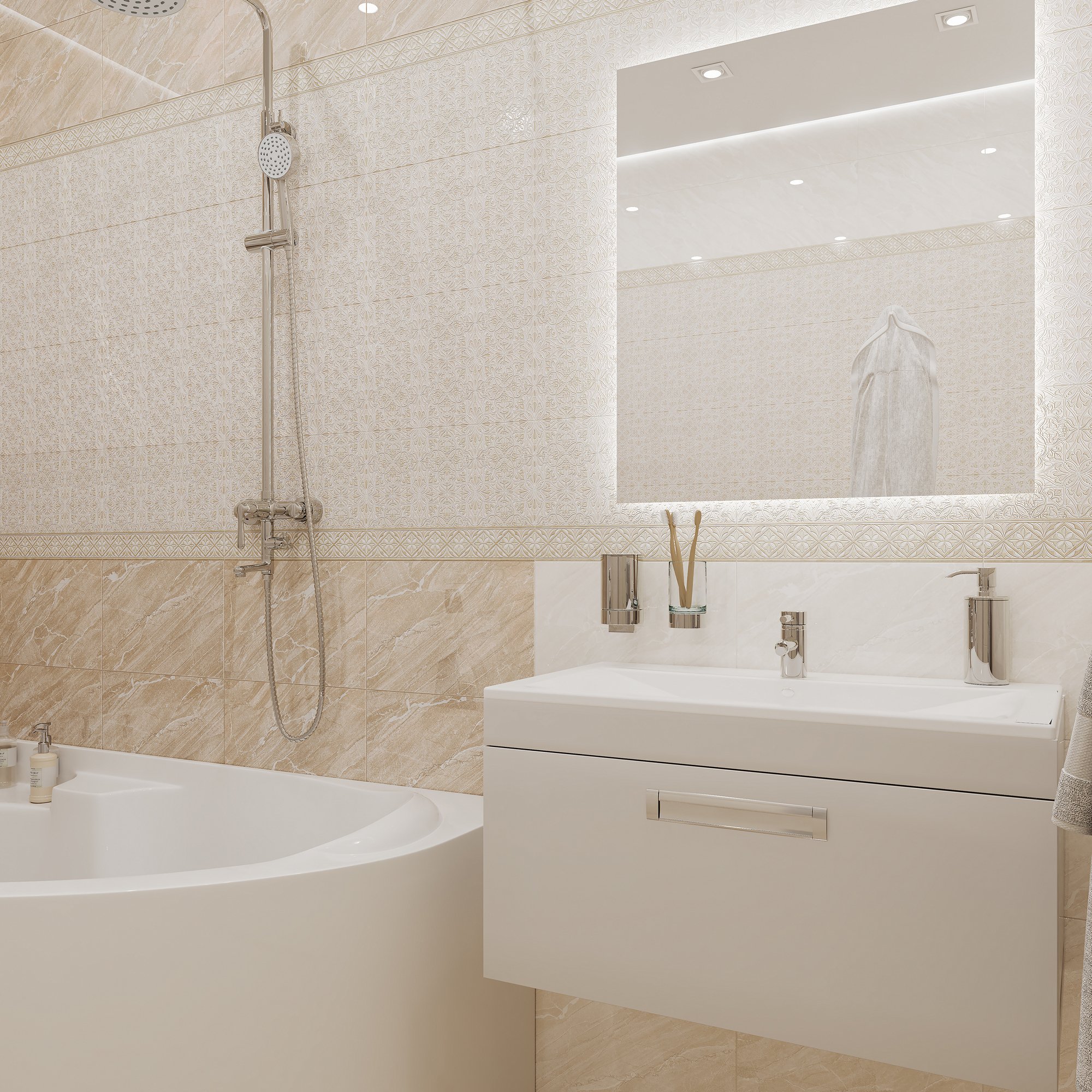 Коллекция Gestia от Global Tile – это воплощение изысканности в классических элементах. Коллекция представляет собой сочетание бежевого мрамора с белыми прожилками и аккуратного панно, выполненного симметричными узорами. Бежевый оттенок коллекции допускает использование смелых интерьерных решений, позволяющих разнообразить цветовую палитру. Gestia поможет достичь абсолютного блаженства, находясь в ванной комнате.