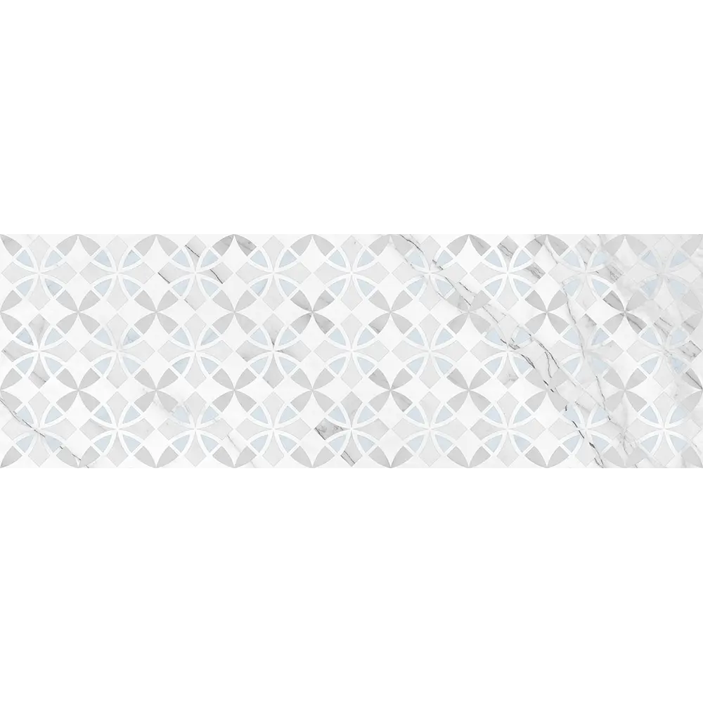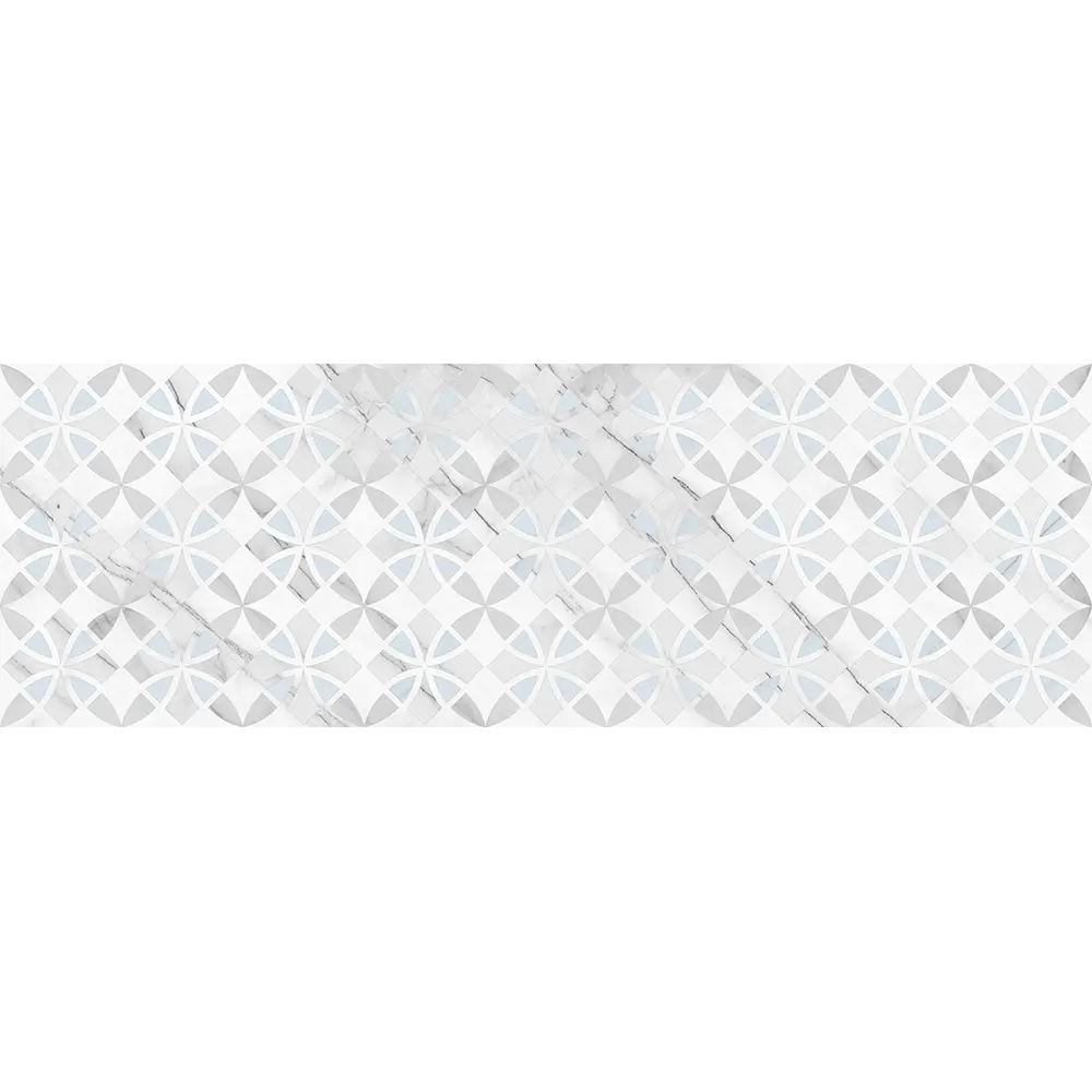 Тонкие хаотичные серые прожилки мрамора дополнены декорацией с орнаментами.